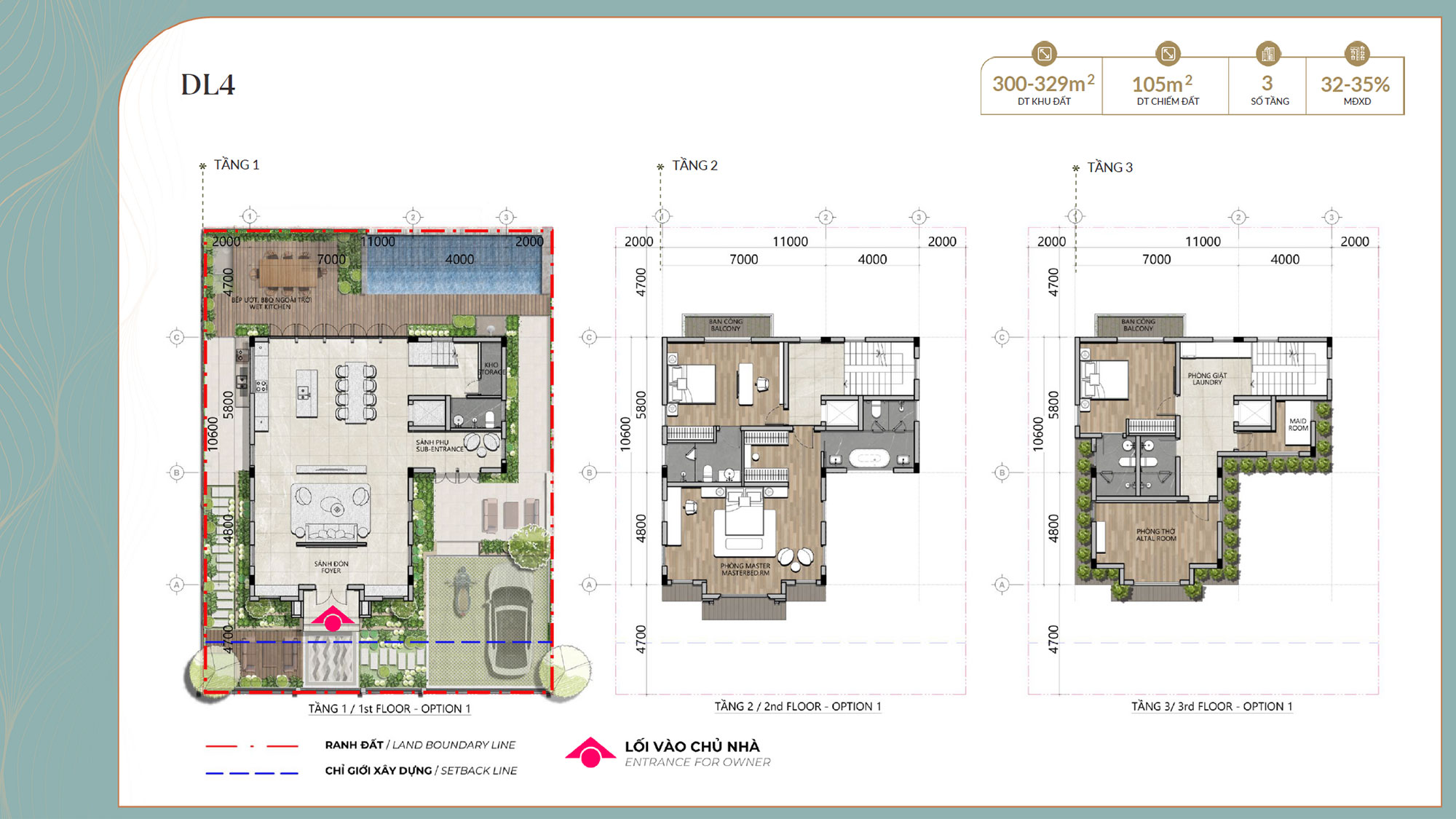 Biệt thự đơn lập | 273 – 435 m2 | 15 m | 32 – 35% | 3 tầng | 40 – 60 tỷ |