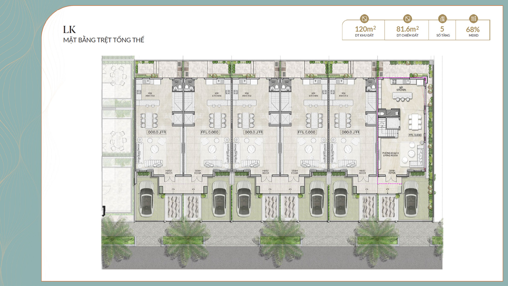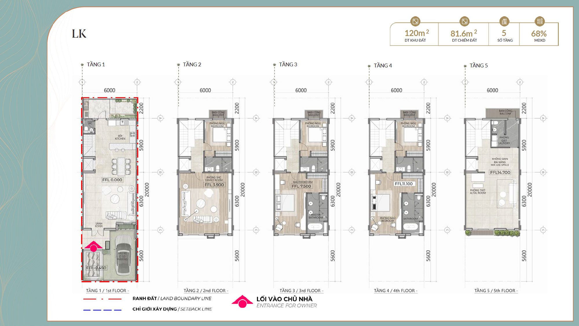 Liền kề | 120 m2 | 6 m | 68% | 5 tầng | 16 – 18 tỷ |