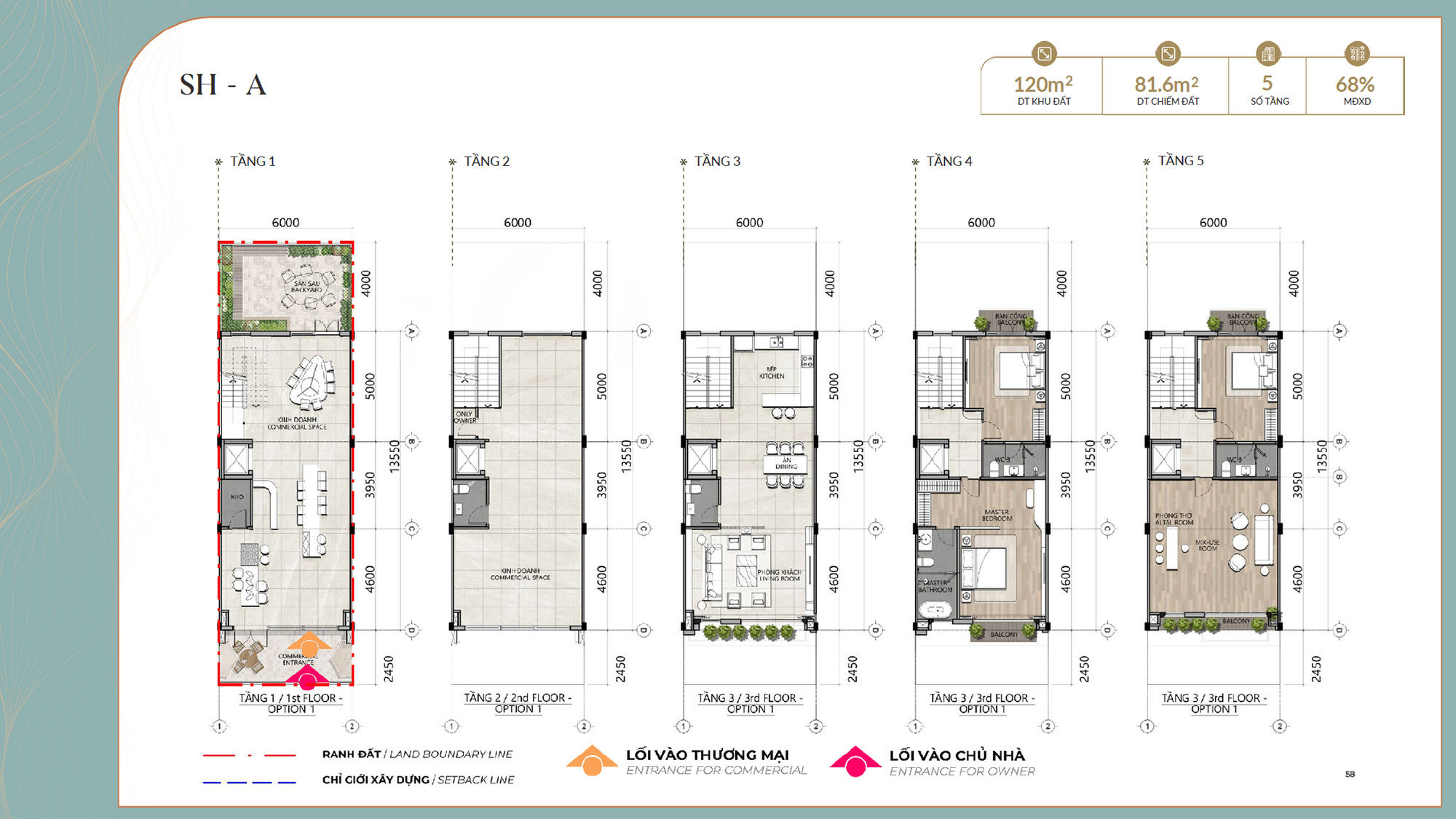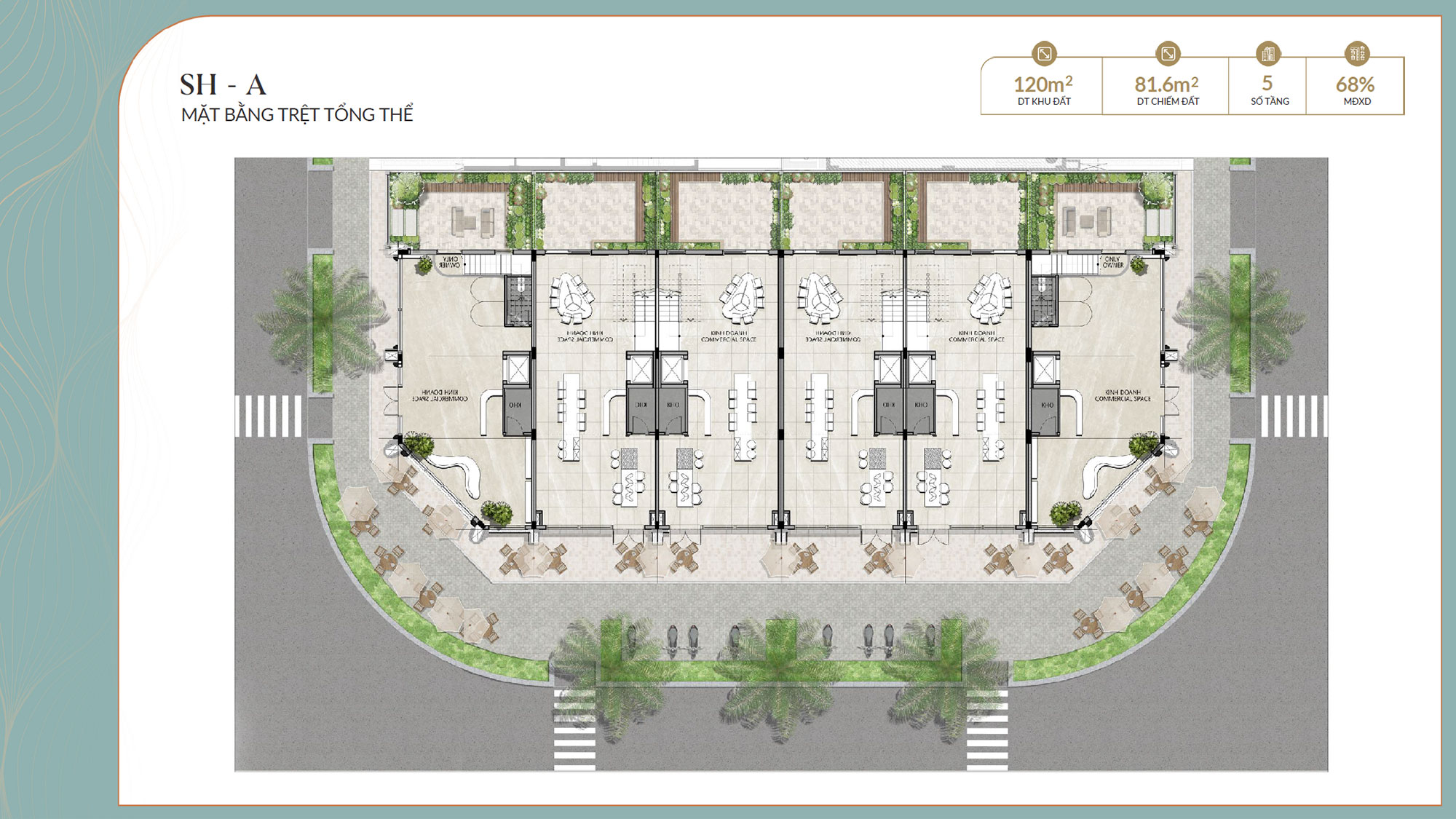 Shophouse | 120 – 140 m2 | 6 – 7 m | 68% | 5 tầng | 20 – 25 tỷ |