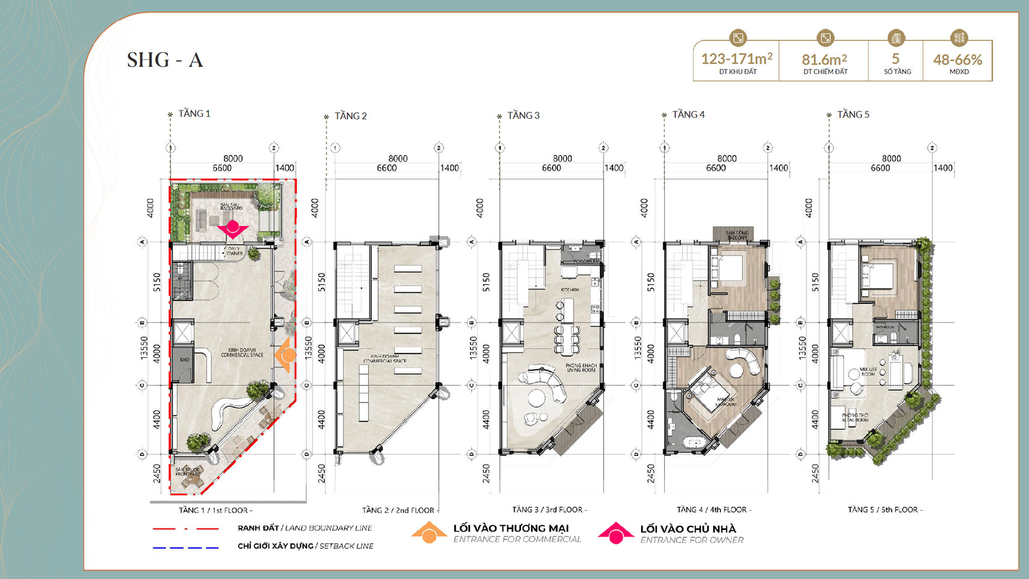 Shophouse xẻ khe | 140 – 160 m2 | 7 – 8 m | 58% | 5 tầng | 25 – 30 tỷ |