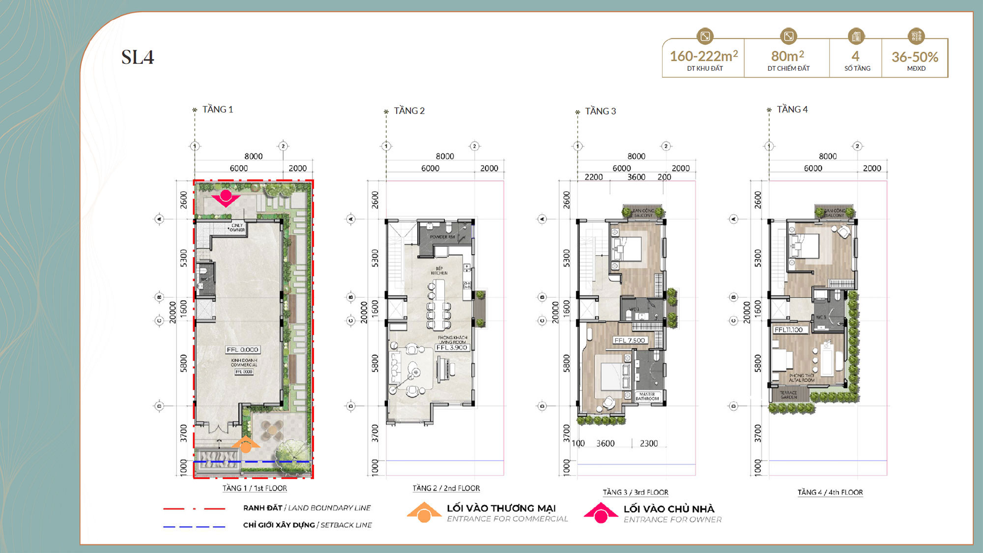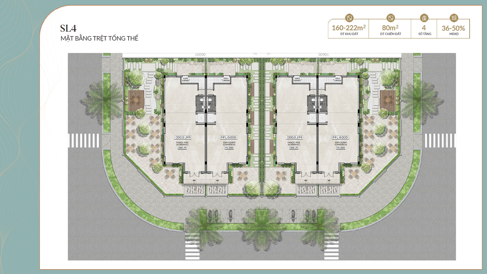 Biệt thự song lập thương mại | 160 – 268 m2 | 8 m | 36 – 50% | 4 tầng | 30 – 50 tỷ |