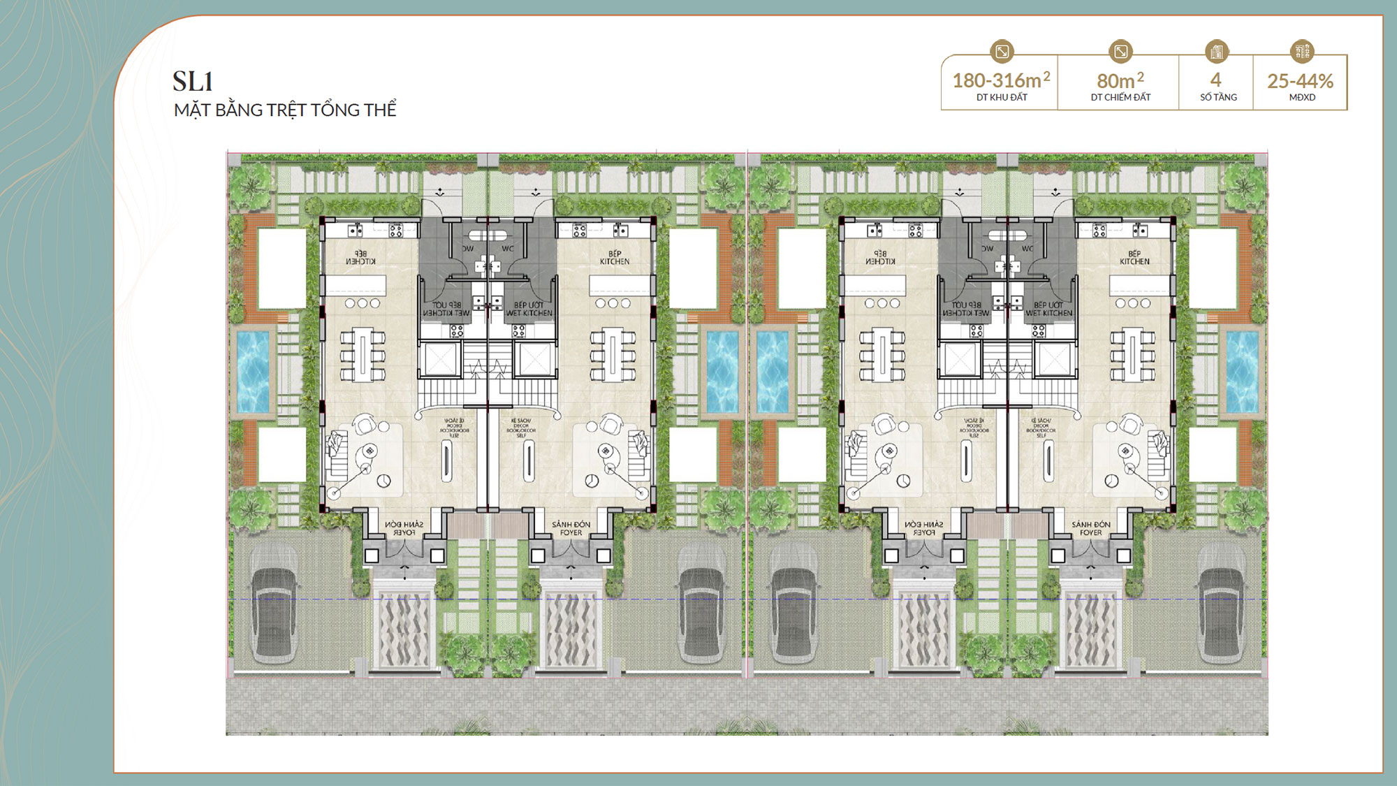 Biệt thự song lập | 180 – 306 m2 | 8 – 10 m | 25 – 44% | 4 tầng | 25 – 45 tỷ |
